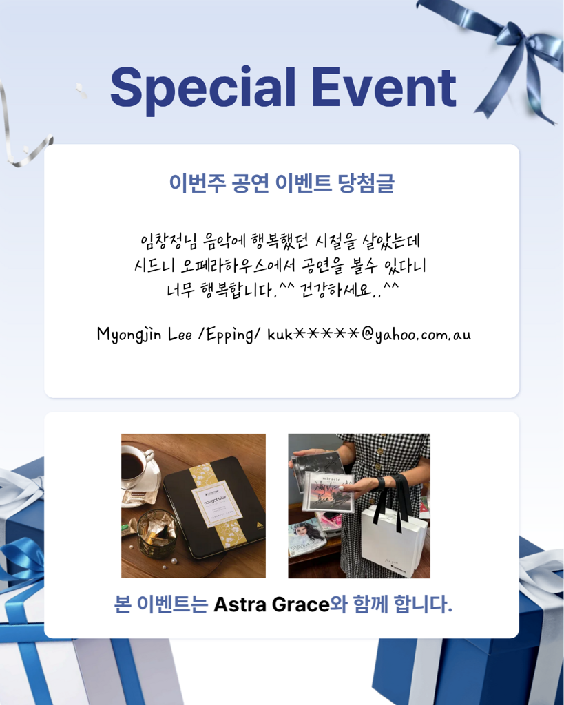 매주 당첨자를 선정하여, Astra Grace 에서 후원해 주시는 소정의 선물을 드립니다.