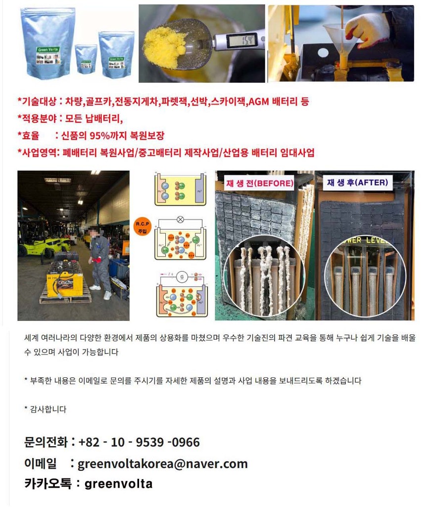 저희 그린볼타 의 주요 사업은 폐배터리 복원사업이며 주로 골프카트 배터리 ,일렉트릭포크리프트,파렛잭,스카이잭 그리고 자동차 AGM배터리를 복원을 하고 있습니다