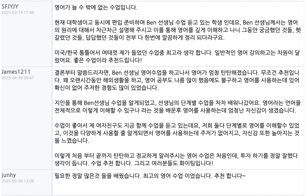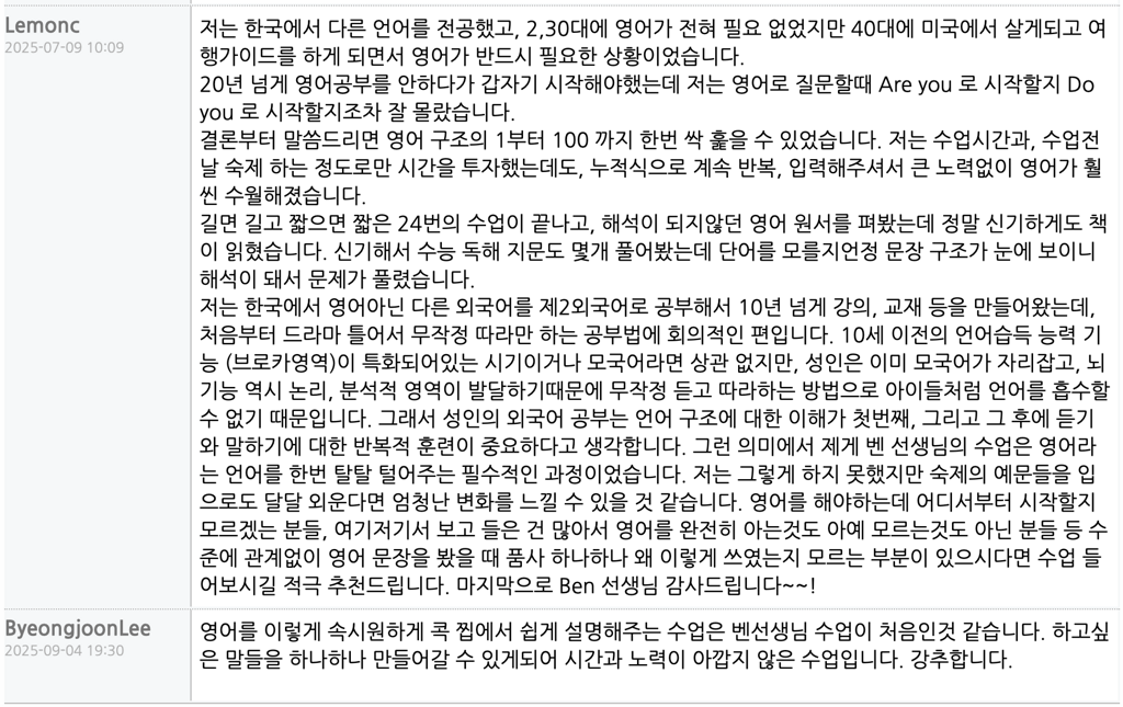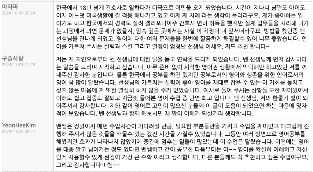 모두 매우 만족하시고 하루가 다르게 세련된 영어를 구사 하실수 있도록 도움 드리고 있습니다!!